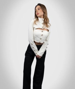 Apie produktą PRODUKTO DUOMENYS Audinys 75% poliesteris, 20% viskozė, 5% lycra. Dydžiai L dydis: Krūtinės apimtis – 92 cm, liemens apimtis – 75 cm, ilgis – 54,5 cm. Spalvos Ecru